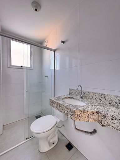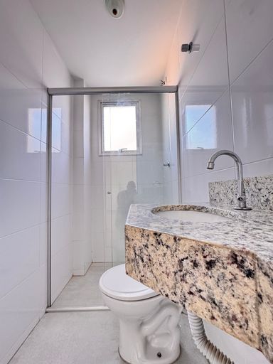 ° Banheiro social com bancada em granito, revestimentos até o teto e box em vidro temperado 8mm;