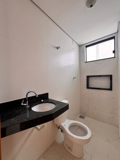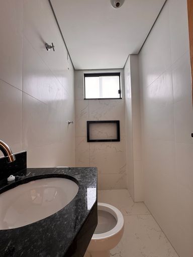 ° Banheiro Social com bancada em granito, cuba da pia de embutir e revestimentos até o teto;