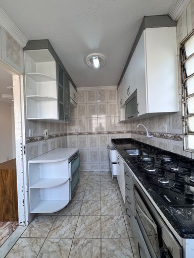 ° Cozinha com bancada em granito, cuba da pia em inox, Armários Planejados, cooktop, forno e revestimentos até o teto;