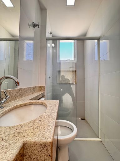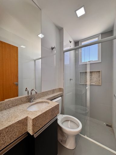 ° Banheiro Social com bancada em granito, cuba da pia de embutir, espelho sobre a bancada, box em vidro temperado de 8mm, nicho na área de banho e Armário Planejado;