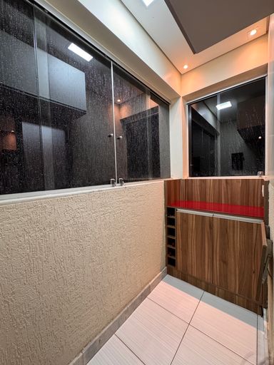 • Varanda com fechamento em vidro temperado e armário planejado aéreo;