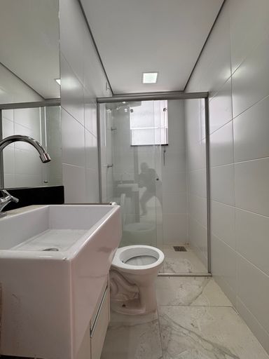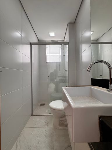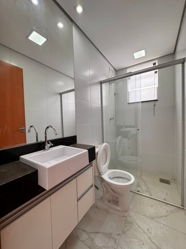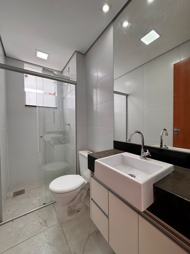 ° Banheiros da Suíte e Social com bancadas em granito, cuba das pias de semi encaixe, nicho nas áreas de banho e revestimentos até o teto;