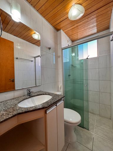 ° Banheiro com bancada em granito, cuba da pia de embutir, espelho sobre a bancada, revestimentos até o teto, Armário Planejado e box em vidro temperado de 8mm;