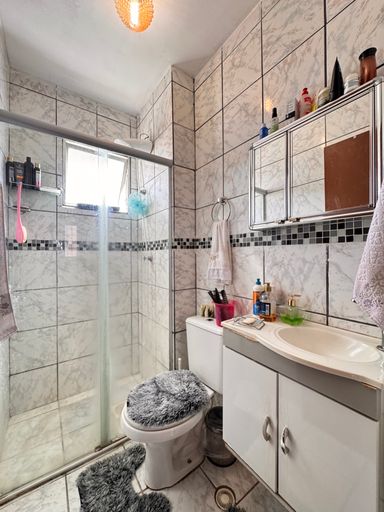 ° Banheiro Social com armário, espelho, revestimentos até o teto e box em vidro temperado;