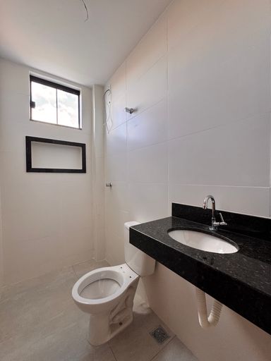 ° Banheiro Social com bancada em granito, revestimentos até o teto e nicho na área de banho;