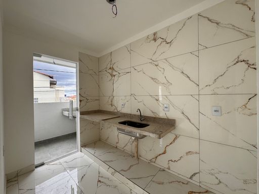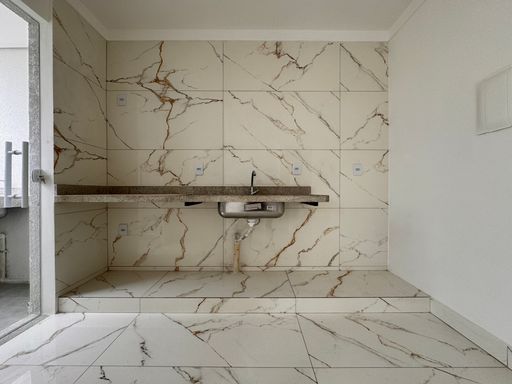 º Cozinha em Conceito aberto com bancada em granito, cuba da pia em inox e revestimentos até o teto;
