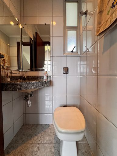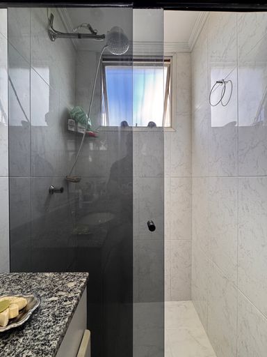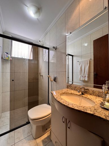 ° Banheiros da Suíte e Social bem amplos com bancadas em granito, espelhos sobre as bancadas, armários planejados, box em vidro temperado de 8mm e revestimentos até o teto;