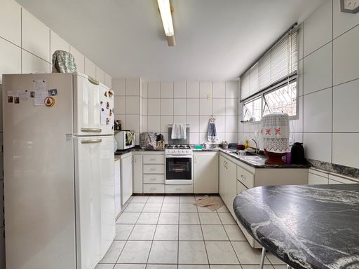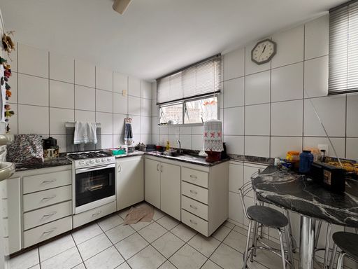 ° Cozinha com bancadas em granito, revestimento até o teto e rica em armários planejados;