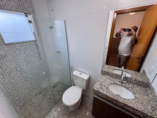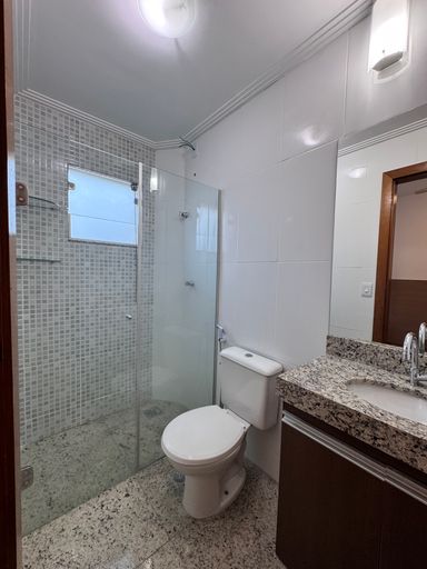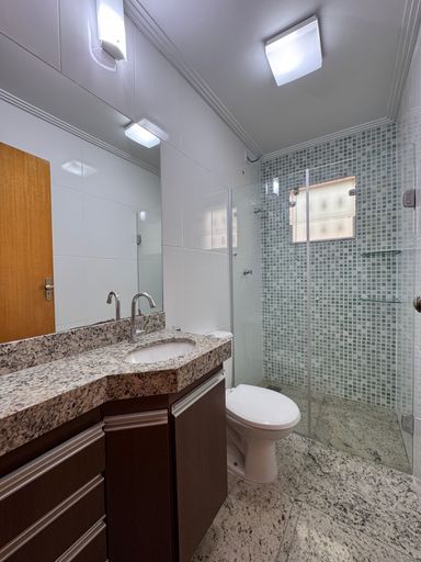 ° Banheiros da Suíte e Social com bancadas e pisos em granito, cuba das pias de embutir, espelho sobre as bancadas, revestimentos até o teto e Box em vidro temperado 8mm;