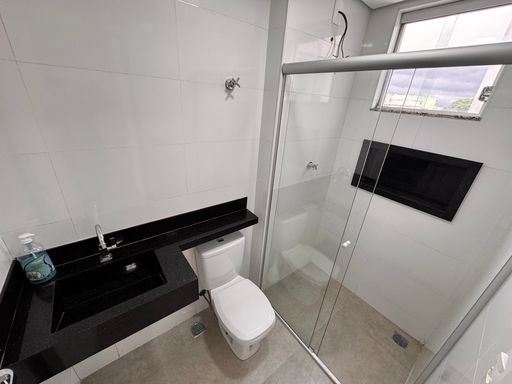 ° Banheiros da Suíte e Social com pias esculpidas em granito, Nicho nas áreas de banho e box em vidro temperado de 8mm;