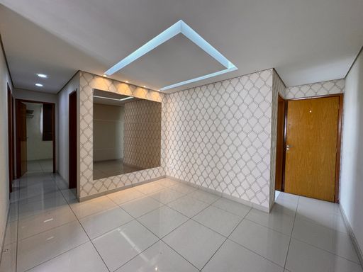 ° Sala ampla para dois confortáveis ambientes com Painel Planejado, Espelho, papel de parede e moderno projeto de iluminação;