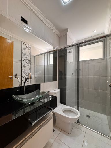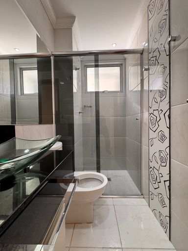 ° Banheiros da Suíte e Social com Armários, bancadas em granito com cubas de vidro de sobrepor, espelhos sobre as bancadas e box em vidro temperado de 8mm;