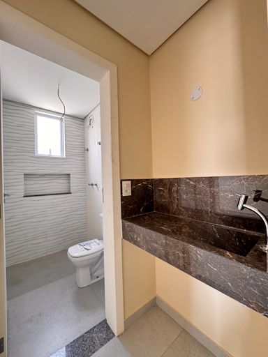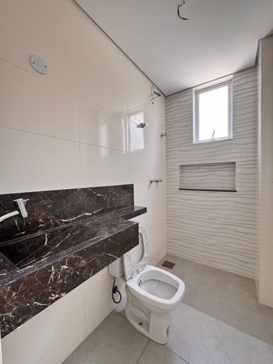 ° Banheiro Social com Toucador, bancada esculpida em granito, nicho na área de banho, revestimentos até o teto e Aquecimento Solar no Chuveiro;