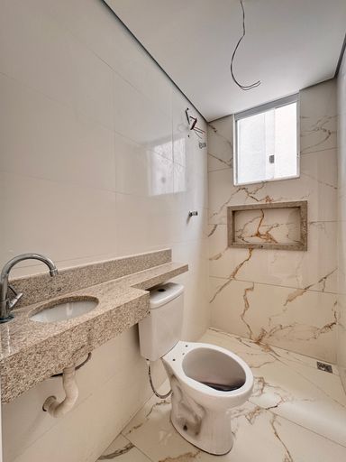 º Banheiro Social com bancada em granito, cuba da pia de embutir, nicho na área de banho e revestimentos até o teto;