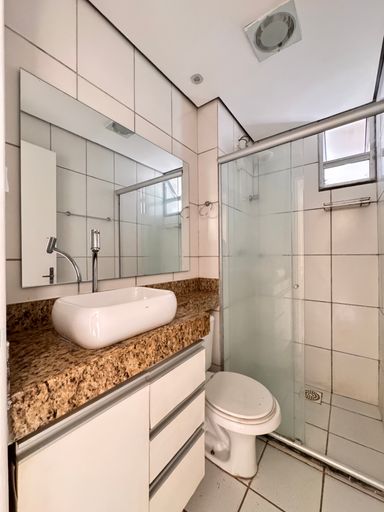 ° Banheiro com bancada em granito, cuba da pia de sobrepor, espelho sobre a bancada, revestimentos até o teto e box em vidro temperado de 8mm;