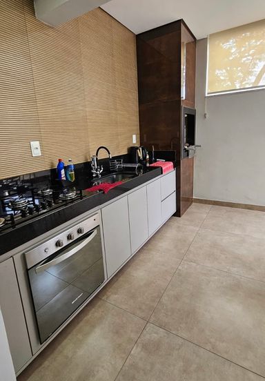 ° Cozinha com bancadas em granito, prateleiras planejadas e revestimentos até o teto;