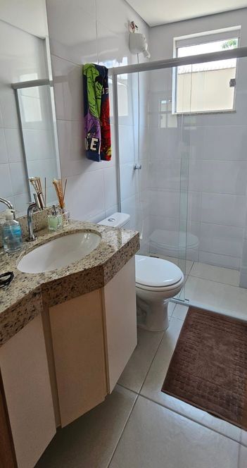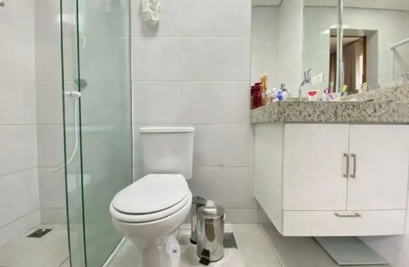 ° Banheiros da Suíte e Social com bancadas em granito, armários planejados, espelhos sobre as bancadas e box em vidro temperado de 8mm;