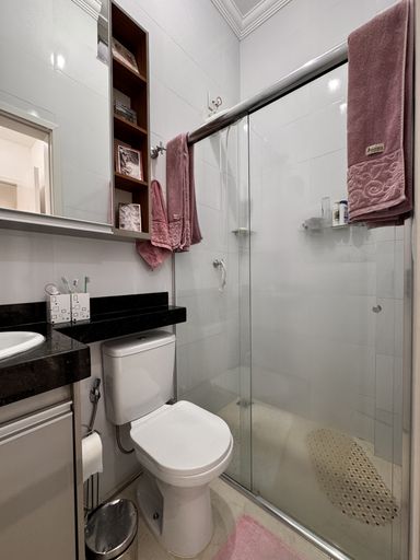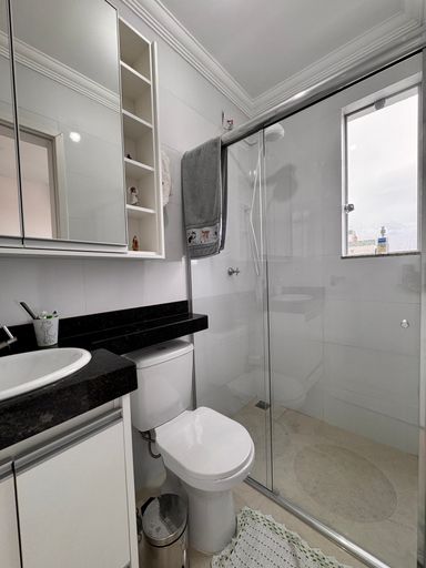 ° Banheiros das Suítes com bancada em granito, armários planejados, espelho sobre as bancadas, revestimentos até o teto e box em vidro temperado de 8mm;