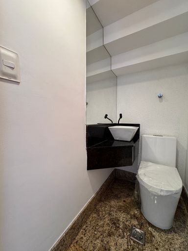 ° Banheiros da Suíte e Social com bancada em granito e , armários planejados e box blindex; ° Banheiro social com bancadas em granito e mármore, espelhos sobre as bancadas, cuba das pias embutidas, armários planejados e box blindex;