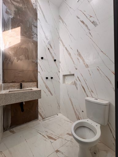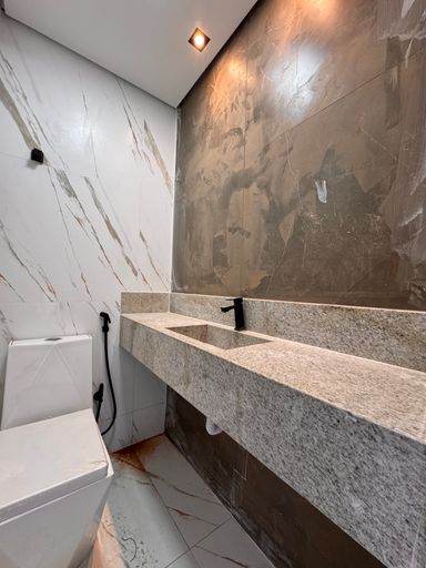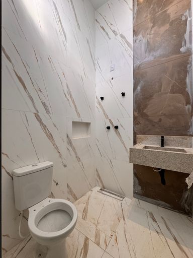 ° Banheiros das Suítes com bancadas em granito, revestimentos até o teto, nicho nas áreas de banho e preparação para aquecimento solar;