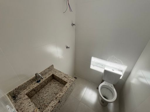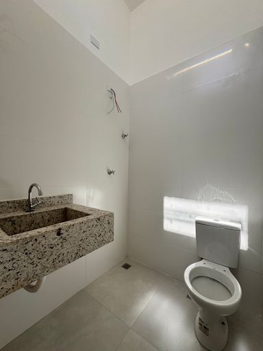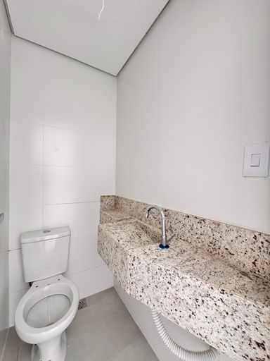 ° Banheiro Social com bancada em granito esculpido e revestimentos até o teto;