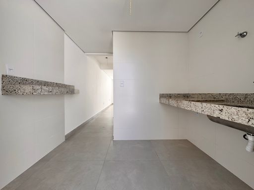 ° Cozinha Ampla com bancadas em granito, cuba da pia em inox e revestimentos até o teto;