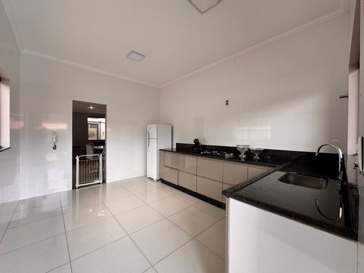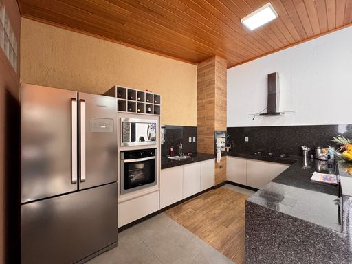 ° Cozinha Ampla com bancadas em granito, armários planejados e revestimentos até o teto;