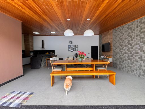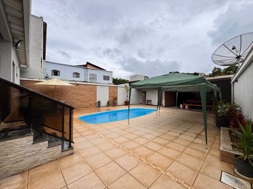 ° Ampla área externa nos fundos com piscina e um lindo e aconchegante Espaço Gourmet coberto, teto rebaixado em lambri, lounge/sala de TV e uma belíssima cozinha de apoio;