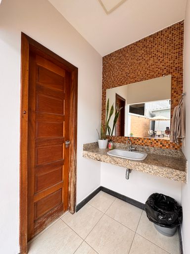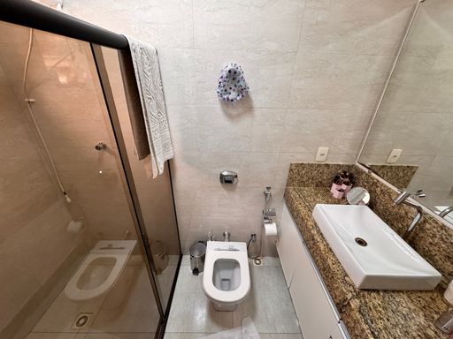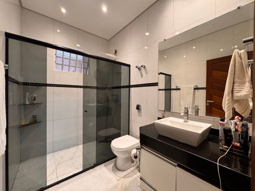 ° Banheiros da Suíte e Social com bancadas em granito, cuba das pias de sobrepor, espelhos sobre as bancadas, revestimentos até o teto e box em vidro temperado 8mm;