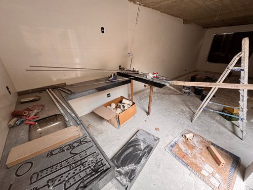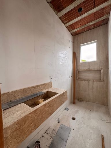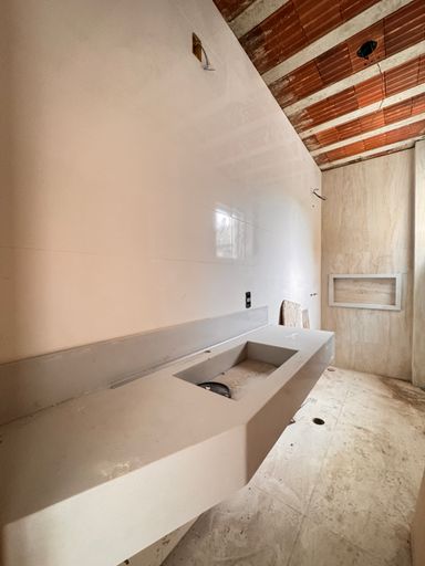 ° Banheiros da Suíte e Social com bancadas em Porcelanato esculpido, nichos nas áreas de banho e preparação para Aquecimento Solar nos chuveiros;