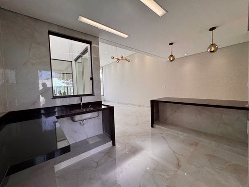 º Cozinha Americana integrada Sala de TV e Jantar e com bancadas em granito, revestimento até o teto e gás canalizado;