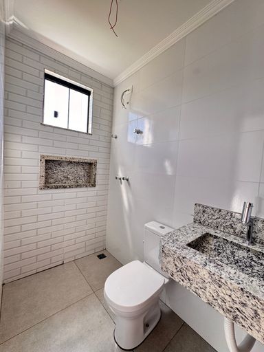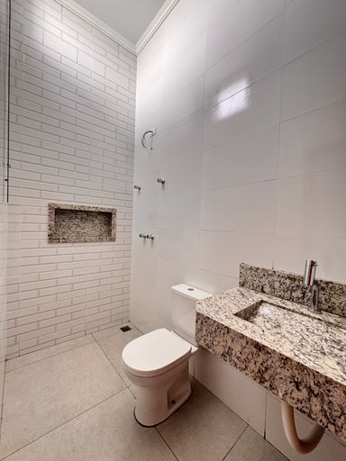 ° Banheiros da Suíte e Social com bancadas em granito, preparação para Aquecimento Solar nos chuveiros, revestimentos em azulejo retrô no box e nichos nas áreas de banho;