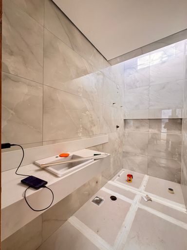 ° Banheiros da Suíte e Social com bancadas em granito, cuba das pias de semi encaixe, revestimentos até o teto, nicho nas áreas de banho e Aquecimento Solar;