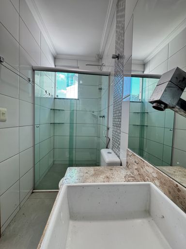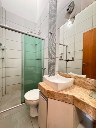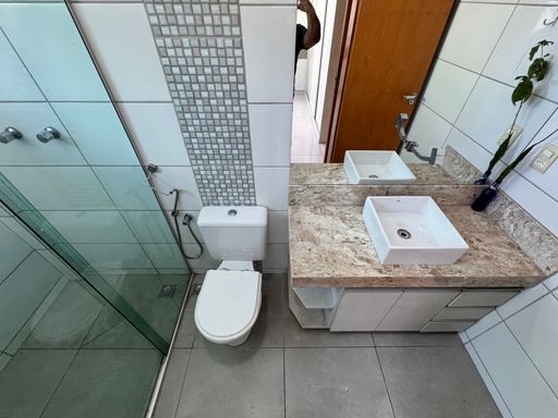° Banheiros da Suíte e Social com bancadas em granito, cuba das pias de sobrepor, armários planejados e box em vidro temperado de 8mm;