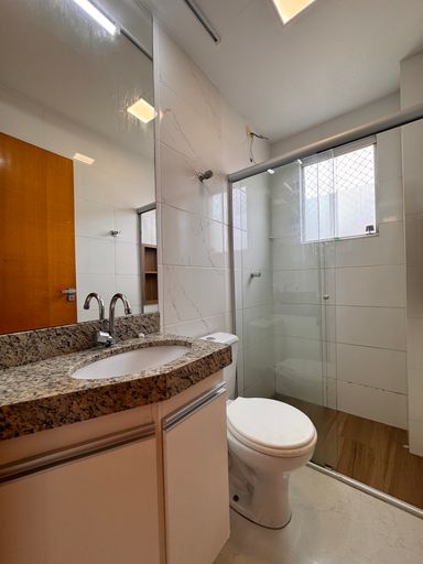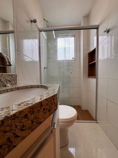 ° Banheiro Social com bancada em granito, armário planejado, espelho sobre a bancada, box em vidro temperado 8 mm e nicho na área de banho;