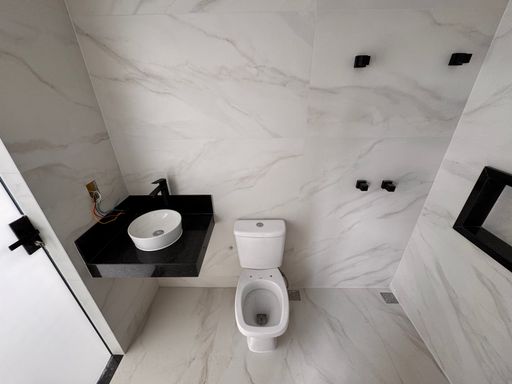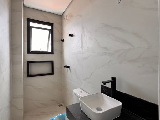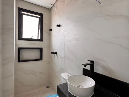 ° Banheiros da Suíte e Social Social com bancadas em granito, nichos nas áreas de banho, revestimentos até o teto e preparação para Aquecimento Solar;
