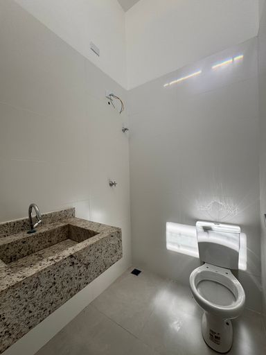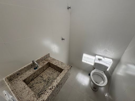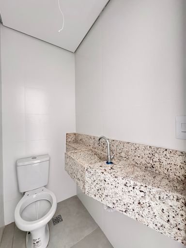 ° Banheiro Social com bancada em granito esculpido e revestimentos até o teto;