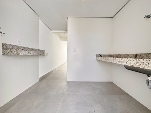 ° Cozinha Ampla com bancadas em granito, cuba da pia em inox e revestimentos até o teto;