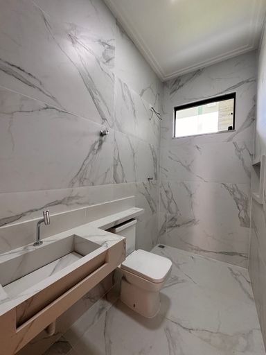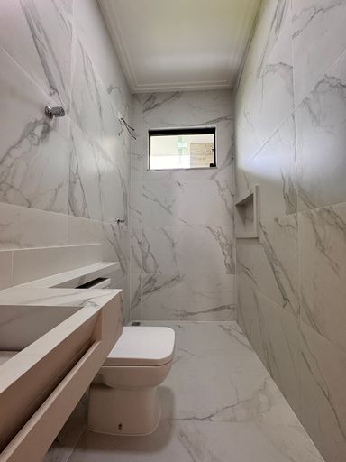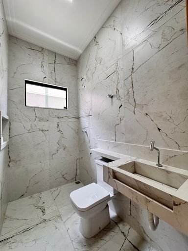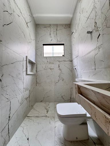 ° Banheiros da Suíte e Social com bancadas em granito esculpido, nicho nas áreas de banho e revestimentos até o teto;
