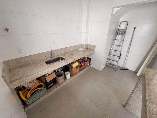 ° Cozinha com revestimentos até o teto, bancadas em granito São Gabriel, cuba da pia em inox e revestimento até o teto;