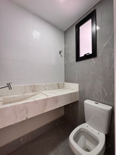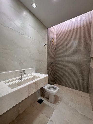 ° Banheiro da Suíte com bancada em mármore branco, nicho na área de banho e preparação para instalação de Aquecimento Solar;