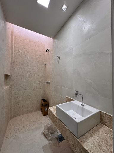 ° Banheiro Social com bancada em granito, cuba da pia de sobrepor, nicho na área de banho e preparação para instalação de Aquecimento Solar;
